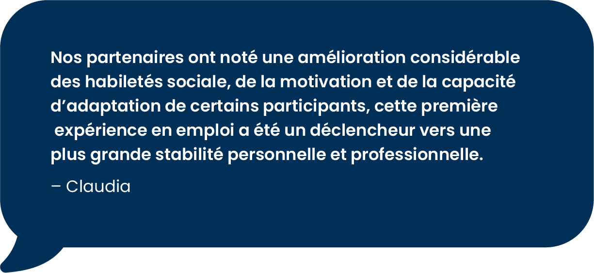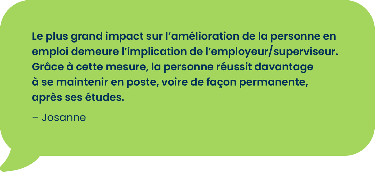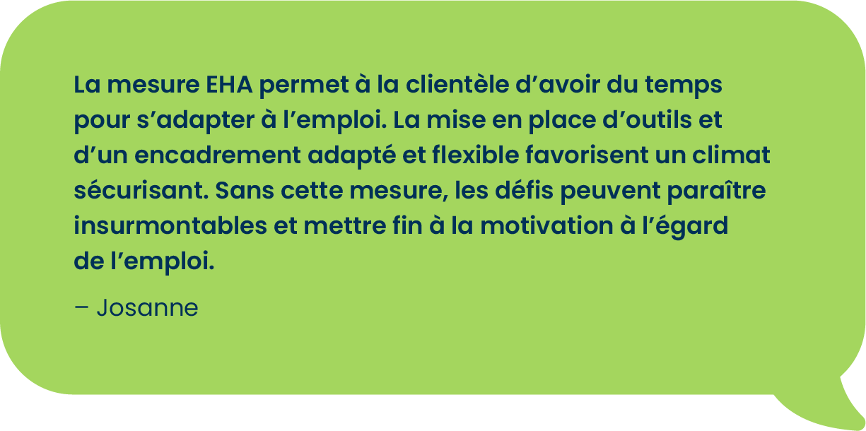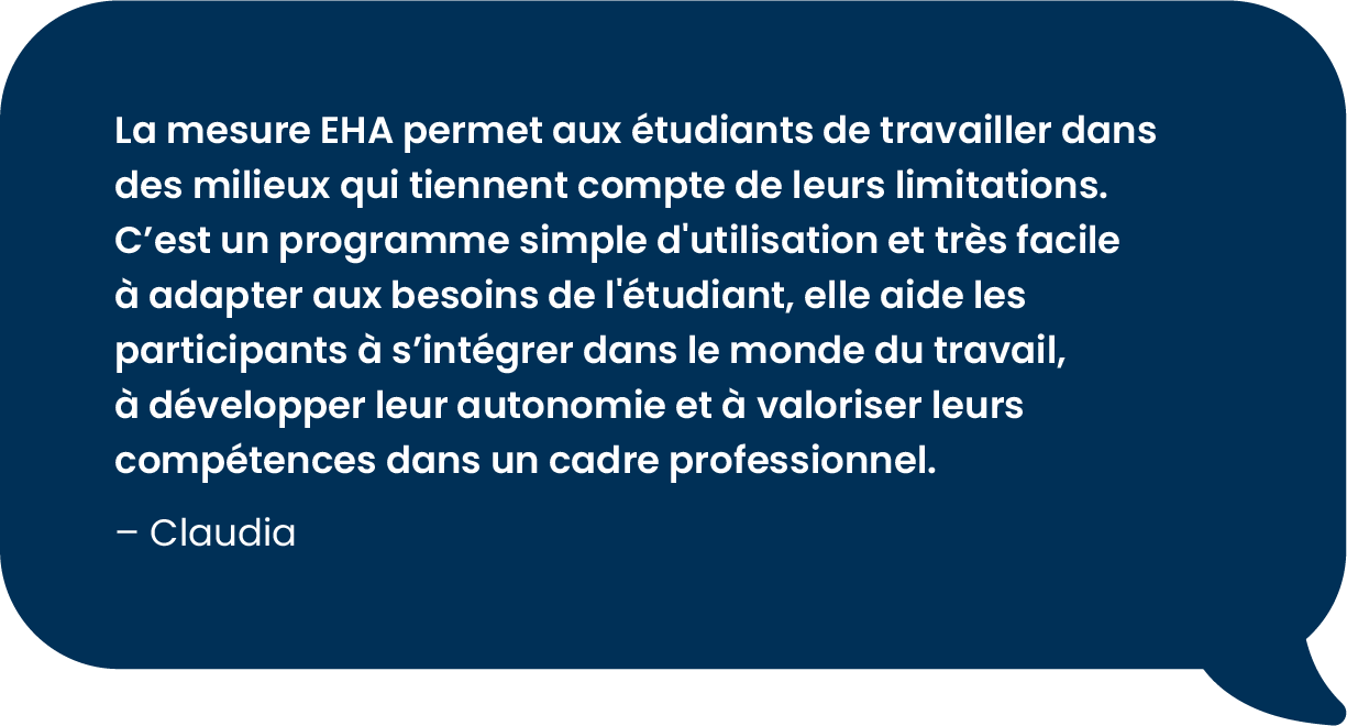 La mesure EHA est très souple et peu contraignante : il suffit de vouloir se familiariser avec le milieu de travail et viser la persévérance scolaire. L’emploi peut être autant en lien avec le domaine d’études qu’avec une passion de la personne.