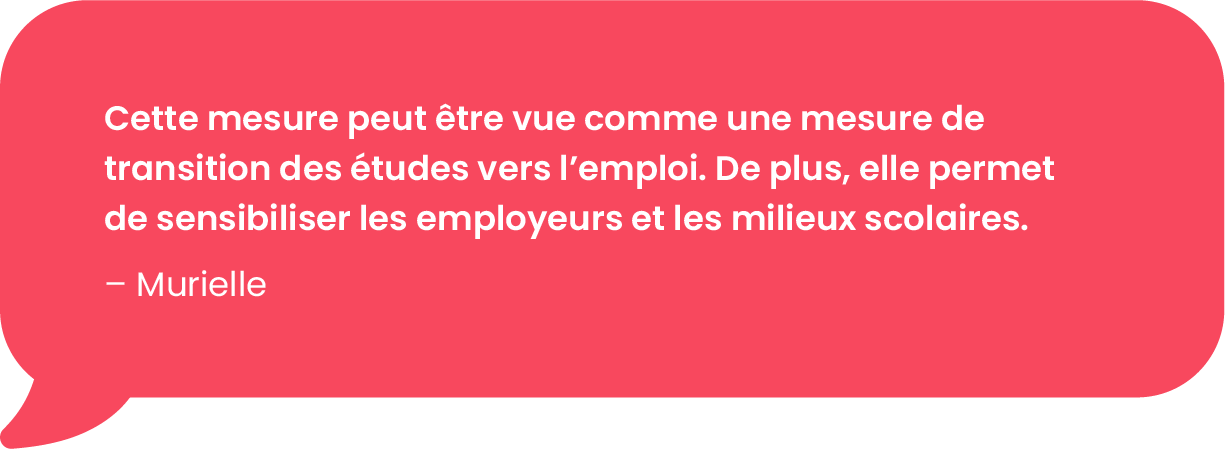 Cette mesure permet par ailleurs au participant de garder son emploi à la reprise de ses études à l’automne, sans minimum d’heures travaillées par semaine, ce qui facilite grandement la conciliation travail-études.